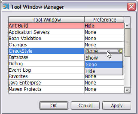 接着,根据项目或自己的偏好为每个工具窗口设置参数。选择Hide参数相应的工具窗口会被隐藏,Show反之,如图所示: