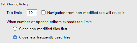 虽然选卡的使用大大简化了文件之间的切换,但是它也有缺点。当打开的文件过多的时候,它会占用大量的编辑器空间。通过设置限制选卡可显示的上限是一个折中的方法,步骤如下,Setting|Editor|General|Editor tabs(PC)或IntelliJ IDEA | Preferences | Editor | Editor tabs (Mac)。通过上面的设置后,IntelliJ IDEA会根据你的设置参数,自动关闭超过上限的选卡。减少选卡过多造成的混乱。至于关闭那些选卡,完全由你选用的关闭策略有关,目前有两种策略,默认情况下会关闭使用频率最少,另一种是优选关闭没有修改过的文件。具体设置如下图: