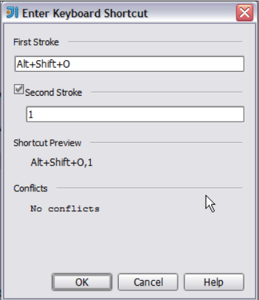 当定义一个新的快捷键时,Second Stroke快捷键在编辑时非常有用的。你可以使用它(Second Stroke)替代冗余的快捷键甚至快捷键组,且方便你记住快捷键。例如, 你可以先定义一个基础的快捷键,Ctrol+Shift+O,然后使用一个数字作为它的Second Stroke,如下图所示:
